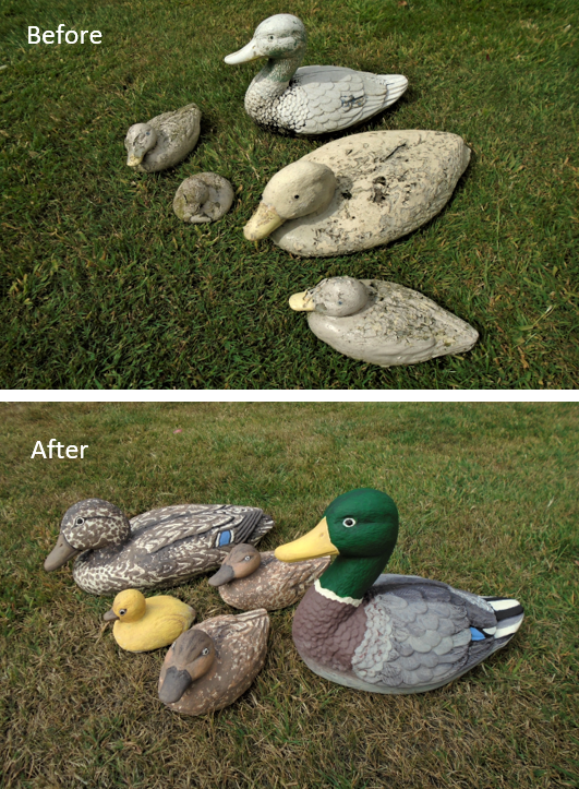 This little project was undertaken for a friend. The stone ducks were old and had succumb to much weathering after spending many years at the bottom of the garden among the undergrowth. They had fallen into neglect, and came to the studio covered in moss and algae. After careful cleaning and an extended period of drying, the new paint was delicately mixed and applied in several layers to recreate the detail and bring these lovely statues back to life again. They have now been returned to their little garden to be looked upon and cherished by their owner.